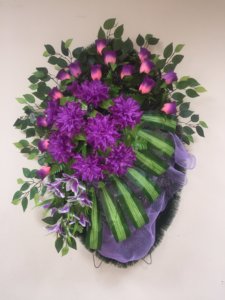 Венок траурный Композиция Георгин сиреневый, Лилия малая сиреневый и Роза бутон розово сиреневый