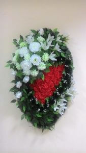 Венок траурный Композиция Роза раскрытая с бутоном Амелия и Лилия малая белый, гвоздика красная с черной