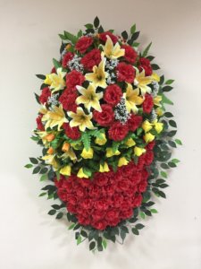 венок траурный Роза атласная красный, Лилия и бутоны розы жёлтый, Тюльпаны