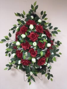 венок траурный Роза игольчатая бордовый с бутонами белый атлас
