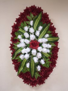 венок траурный Роза игольчатая с бутонами атлас бордовый с белым