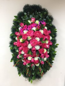 Венок траурный Роза Натали атлас Роза бутон Амелия атлас бело малиновый